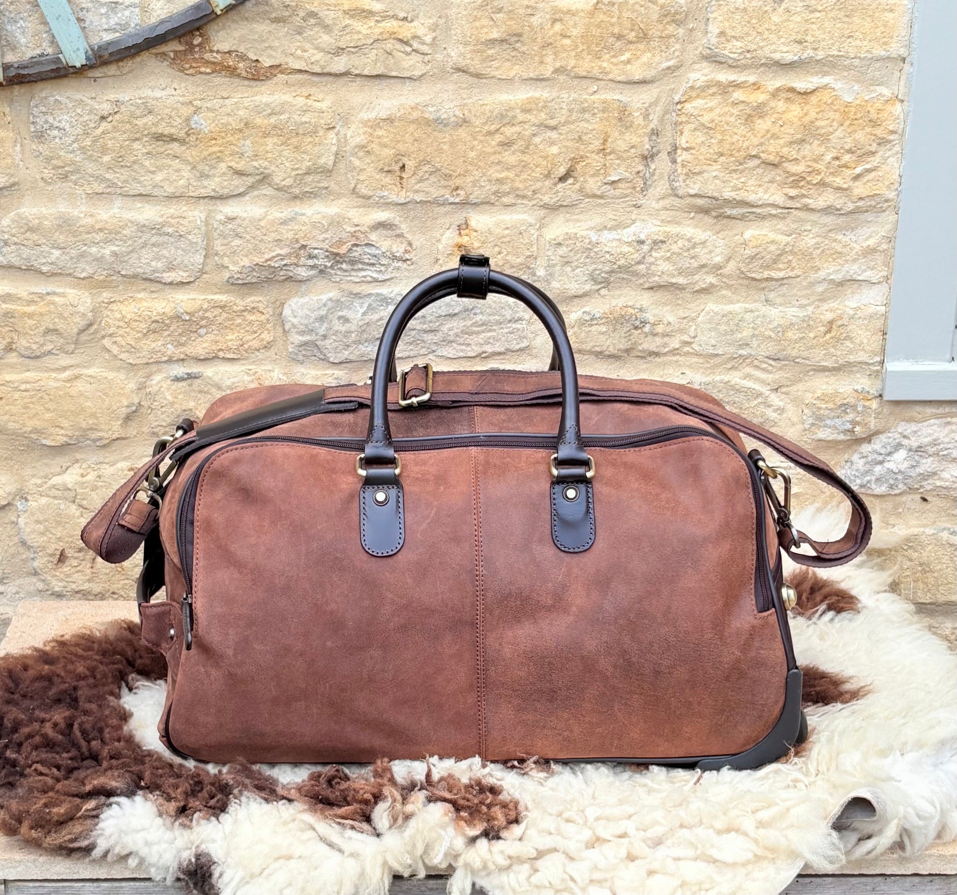 Blending heritage craftsmanship with modern ease, the Batsford Wheeled Trolley Weekender takes inspiration from the strength and grace of the thoroughbred. Made in saddle oiled leather, it features smooth-rolling wheels, a telescopic handle, and a generous interior—delivering classic equestrian elegance with the practicality of contemporary travel.